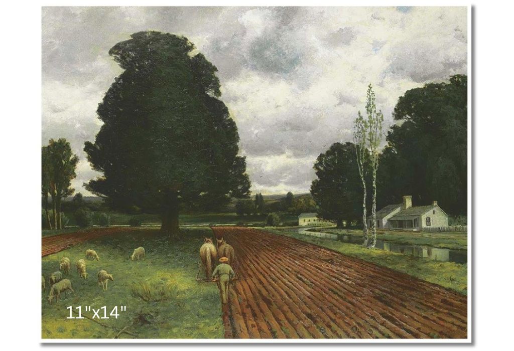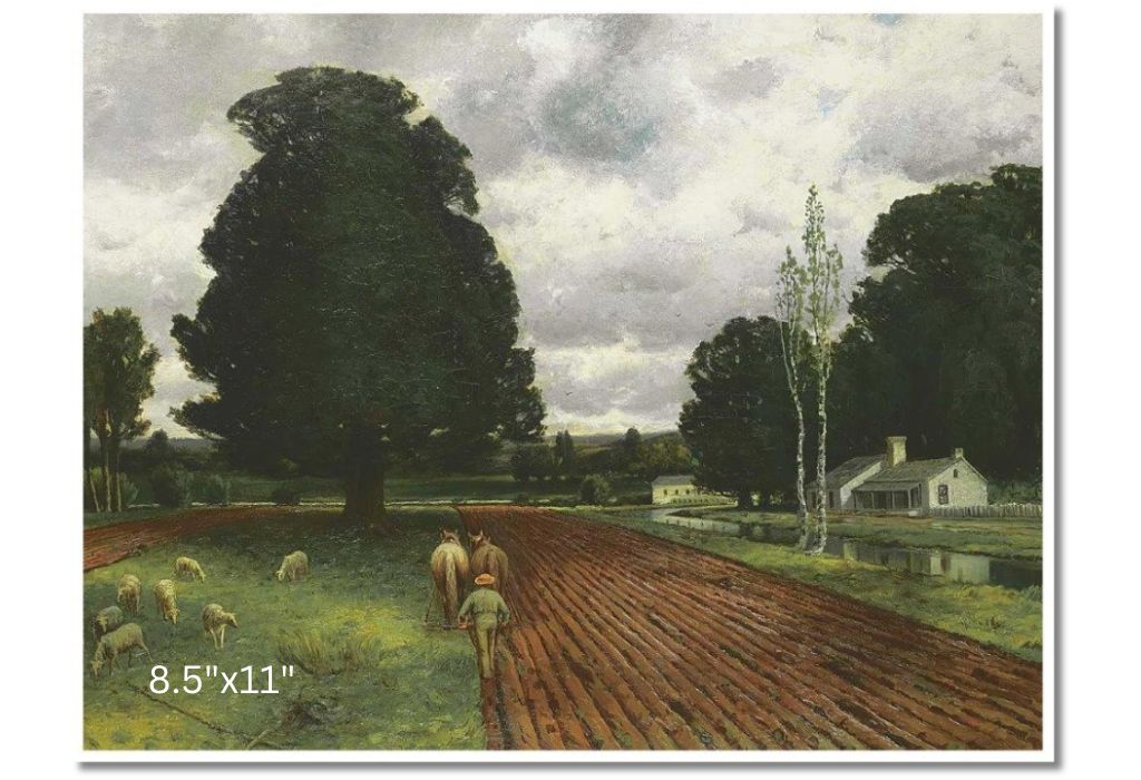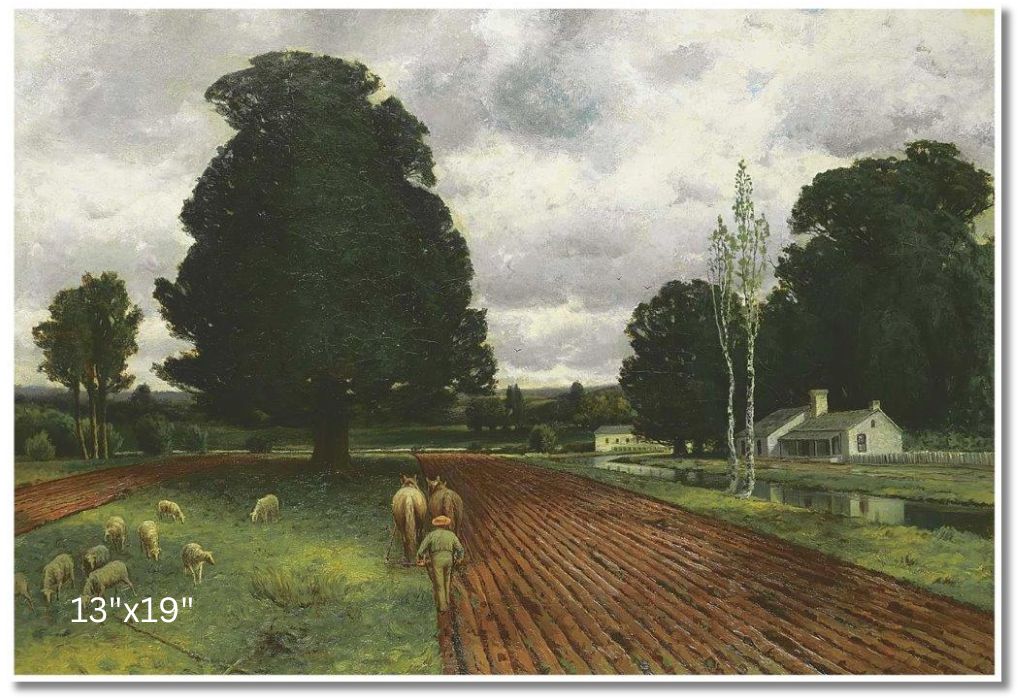 Land of Thrift by Homer Watson depicts a rural Canadian landscape with rolling fields, a meandering stream, and a modest farmhouse nestled among trees. The scene highlights Canada's rural heritage and the importance of farming in the country's development, symbolizing the resilience and hard work of those who cultivated the land.