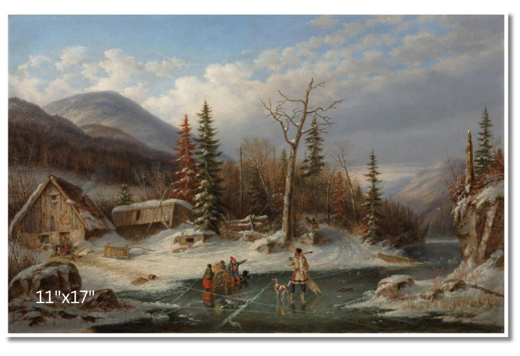 Cornelius Krieghoff's Winter Landscape, Laval portrays a tranquil rural scene, blending human activity with natural beauty. Set against snowy mountains and evergreens, villagers skate and gather on frozen waters near rustic cabins. A hunter and his dog observe the lively moment, reflecting the harmony of life and wilderness in 19th-century Canada.