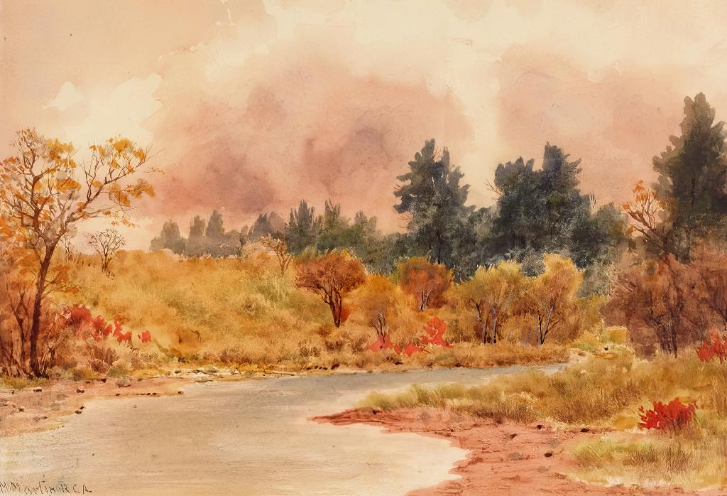 This watercolor painting, titled "Autumn Creek, Still Waters" is another work by Thomas Mower Martin, an artist central to the development of Canadian landscape painting. Born in London in 1838, Martin moved to Canada in the 1860s, where he became a founding member of the Royal Canadian Academy of Arts.