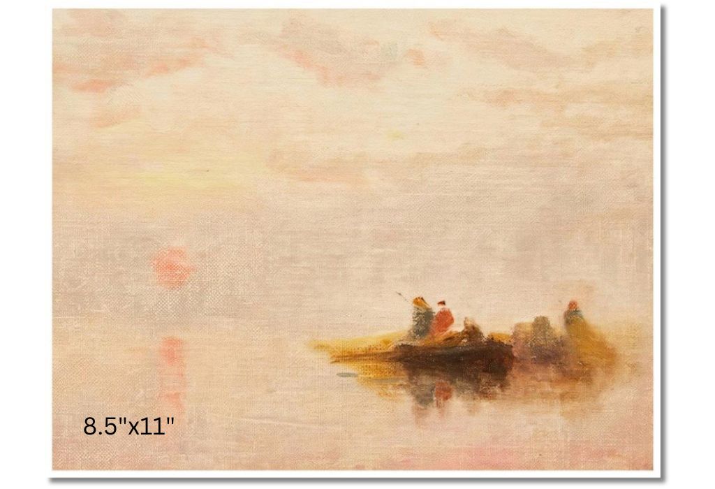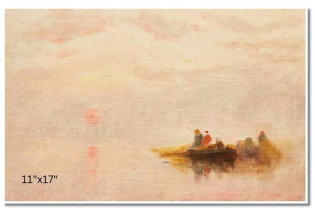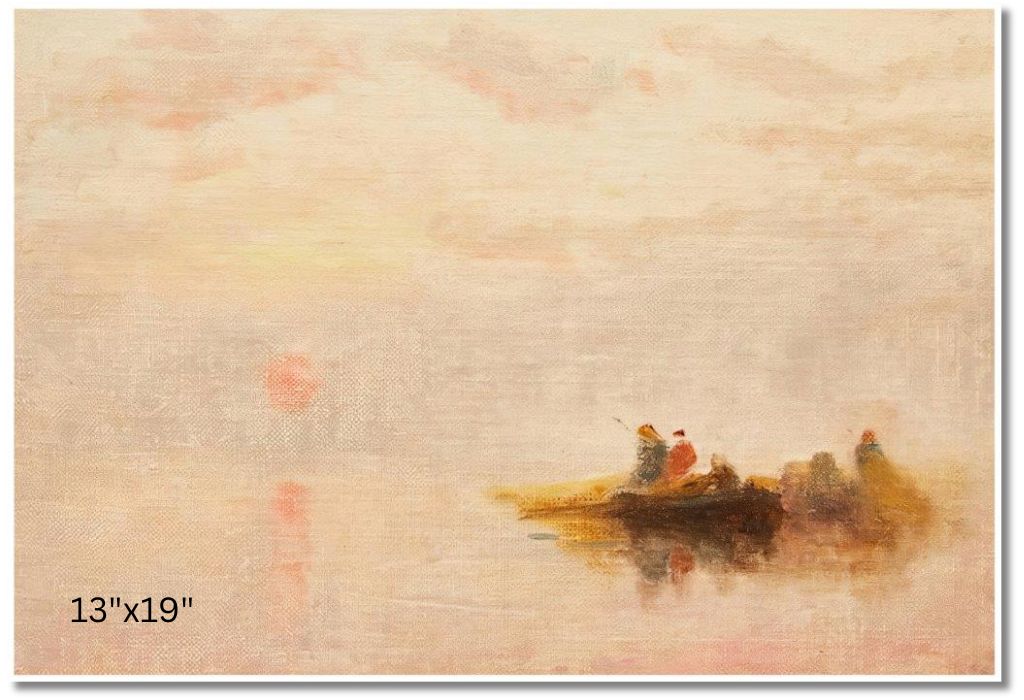 John A. Hammond captures the tranquil dawn over the Bay of Fundy, with the rising sun casting a warm glow on the still waters and rugged coastline. Hammond, born in Montreal in 1843, was renowned for his depictions of Canadian landscapes. His career as a lithographer and painter focused on celebrating Canada's natural beauty. The Bay of Fundy, known for its record-high tides, holds historical significance in Canada's maritime history, symbolizing the region's importance in trade, fishing, and early settlement. Hammond's work beautifully encapsulates this vital part of Canada's heritage.