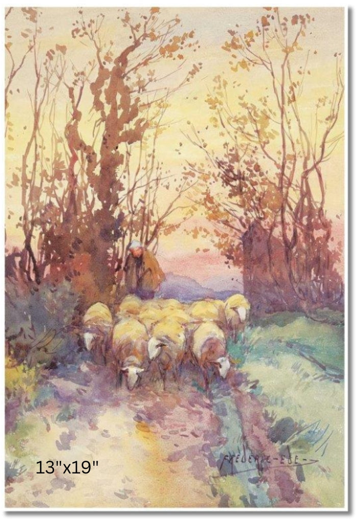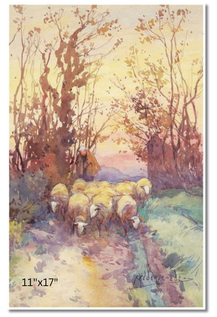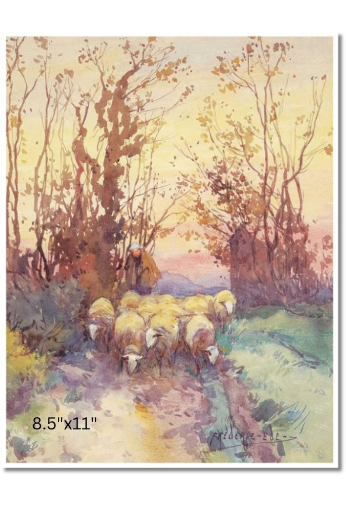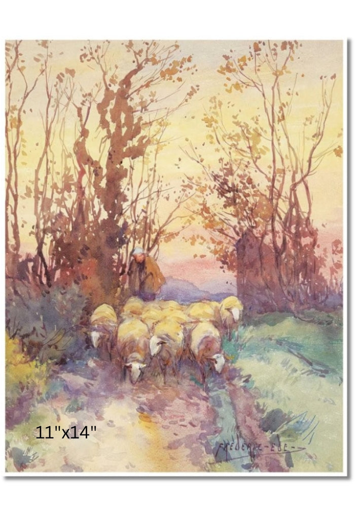 In this tranquil watercolour, a shepherd guides his sheep along a quiet path framed by autumnal trees. The fading light casts a warm, golden hue over the scene, evoking a peaceful end to the day's labours.